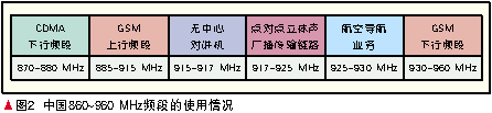 图2显示了中 国在860~960 MHz频段的频率使用现状,920~925 MHz的RFID频段实际上是立体声广播点对点传输业务频段分出5 MHz与RFID共用,与GSM上/下行频段只有5 MHz的频率间隔,与无中心对讲机系统只有3 MHz的频率间隔。