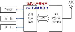 ZigBee无线通信模块在整个集线器设计中也起着举足轻重的作用。ZigBee模块中RF(射频)收发器采用射频收发模块采用UZ2400芯片,微处理器采用8051芯片。RF收发器是ZigBee设备的核心,任何ZigBee设备都要有RF收发器。它与用于广播的普通无线收发器的不同之处在于体积小,功耗低,支持电池供电的设备。它主要进行信号的调制与解调、发送和接收等。微处理器通过SPI总线与RF收发器相连,主要用于处理射频信号、控制和协调各部分器件的工作,通过串口与外部设备之间进行通信。ZigBee模块还包括存储器、晶振、天线、串口等器件。如图3所示: