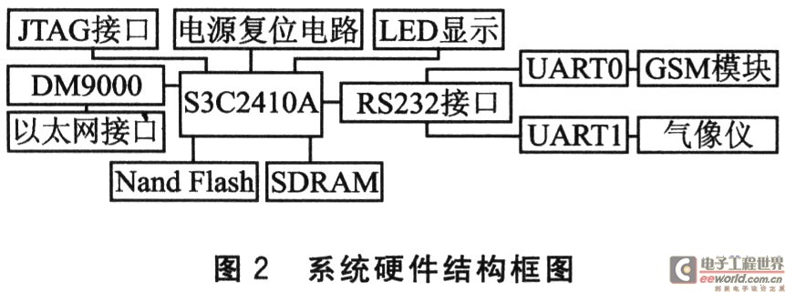 监控系统控制器的核心CPU选用基于ARM920T内核的16/32位RISC处理器 S3C2410A。该处理器功能强、性价比高、功耗低,提供了一套较完整的通用外围设备接口,带MMU(内存管理单元),可支持Linux、μC/OS- II、WindowsCE等多种操作系统的移植。系统硬件结构框图如图2所示。