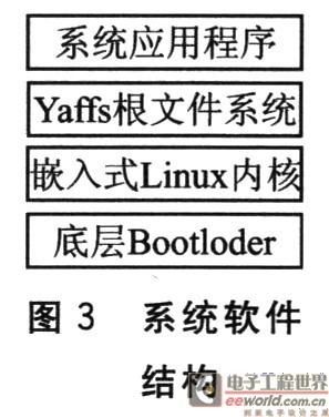 整个系统软件结构从下到上大体可分为3个层次,如图3所示:底层的Bootloder、嵌入式Linux内核以及系统应用程序。