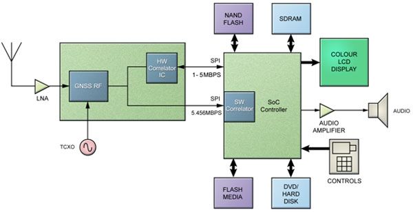 以高性价比的方式实现伽利略/GPS功能的关键,就是利用现有架构中未被充分使用的计算能力,在软件中实现一部分的基带处理功能。例如,手机有一个应用处理器负责处理与通信无关的所有功能,随着人们对多媒体服务(如音乐和视频播放)兴趣的与日俱增,这种处理器已经变得越来越强大。然而,当这些服务不使用时,应用处理器常常处于闲置状态,一般来说会被断电,以降低它消耗的功率。
