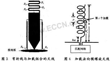 前人已经做过很多关于加载天线的研究,Altshuler第一个根据传输线理论,将偶极子天线近似看作开路传输线,在距离开路末端1/4波长处串联一个等于开路线特性阻抗的电阻,可以在天线上得到行波电流,从而使偶极子天线在较宽的频带内匹配良好。由于天线要求加载点到末端的距离为1/4波长,若该条件不满足,加载电阻的作用就会被削弱甚至不起作用。这样很难在HF,V/UHF频段继续减小天线的尺寸。最近,BOag和Mittra等人提出用RLC并联电路对单极子天线实行分段加载。同时借助遗传算法和计算机模拟全局搜索最佳加载位置和加载元件值,成功设计了30~450 MHz单鞭和双鞭加载天线。孙保华博士在综合上述方法,结合加载快速处理技术以及GA与SA相结合的优化设计方法设计制作了单鞭天线,进一步优化了天线的性能指标。虽然R,L,C及其组合加载可以减小天线尺寸,展宽天线带宽。但是有耗元件的引入必将降低天线的辐射效率。阻抗加载天线是通过牺牲增益来获得宽频带特性的,因此带宽和增益之间是一对矛盾,尤其是当频率较低、天线电长度较小时,这种矛盾表现得更突出。在实际的通信中,往往要求天线既有好的带宽又有可以接受的增益。因此,设计时必须在带宽和增益之间做一个适当的选择。