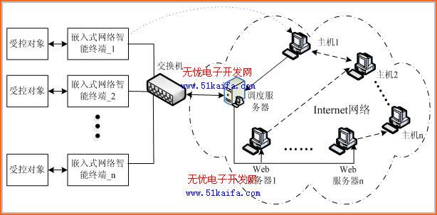嵌入式网络智能控制系统的应用环境与网络拓扑结构如图1所示。图1所示的拓扑结构由嵌入式网络智能终端、调度服务器、Web服务器组、Internet主机组成。嵌入式网络智能终端采用uCLinux操作系统,该终端直接与以太网相连,将数据传送到Internet广域网的Web服务器。调度服务器在该系统中起负载调度的作用,不至于Web服务器中的某个服务器负载过重。Web服务器组收集嵌入式网络智能终端系统的数据,应答广域网主机的访问。广域网中的主机可以随机访问Web服务器获取嵌入式网络智能终端的数据,有特定权限的主机并可以直接访问嵌入式网络智能终端。