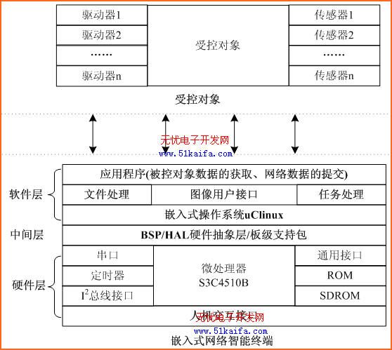 受控对象软件部分涉及传感器如何收集受控对象的信号,如何驱动受控对象和外设,怎样将信号传送到嵌入式网络智能控制终端。