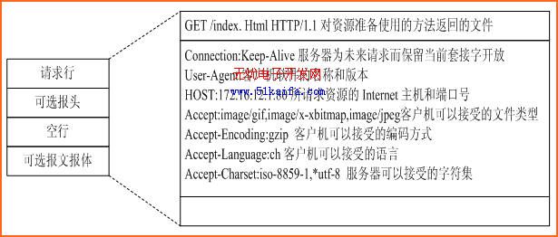 图4显示HTTP请求报文由请求行、可选报头、可选报文报体字段组成。请求行建立后来活动的舞台。可选报头指出客户机请求的协议,以及服务器在应答之前要了解的客户机的信息。