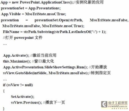 本系统通过引用互操作程序集 Microsoft.Office.Interop.PowerPoint 实现Office 自动化过 程,利用.NET 编写应用程序来实现在PC 端控制Powerpoint 应用程序。PC 端通过蓝牙通信 接收SmartPhone 端发来的指令,利用 Powerpoint 的自动化功能实现文档的打开、关闭、缩 放、播放等控制功能,并且将获得的Powerpoint 的总页数、当前播放页等信息返回给 SmartPhone 端进行显示。理论上来说通过用户界面手动执行的操作几乎都可以通过该解决方案来执行。主要控制代码如下:
