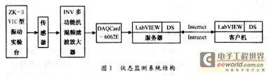 监测系统硬件结构如图1所示。此系统的基本工作原理是,ZK-3VIC型振动实验台作为被测对象,加速度传感器将振动信号转换为电压信号,由于传感器拾取的信号比较微弱,且常伴有噪声的干扰,所以要对信号进行滤波和放大,这些工作由INV多功能抗混频滤波放大器来完成,DAQCard-6062E将经滤波放大后的模拟信号转换为数字信号,以便于微机处理,服务器和客户机为两台计算机。