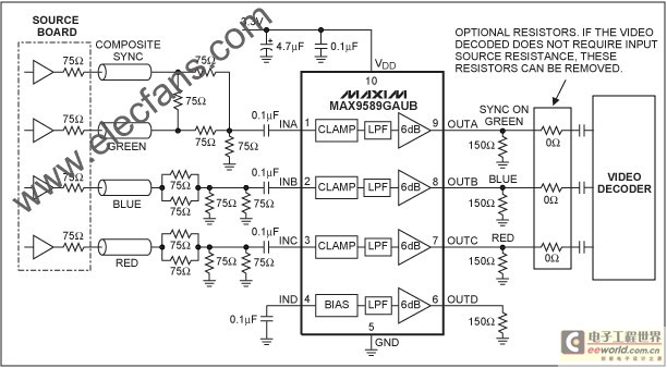 该应用中,选择使用MAX9589具有一个优势,MAX9589可以作为视频解码器前端的抗混叠滤波器,有助于改善视频信号质量。