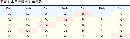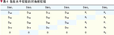 水平校验与对角校验如表1所示。表1中D代表用户数据单元,P代表冗余校验单元。可以看出,Disk1—Disk5存储用户数据单元;Disk6、7存储冗余校验单元。Disk6的各单元为用户数据各行的水平校验和,而Disk7的各单元为用户数据的辅对角线校验和。