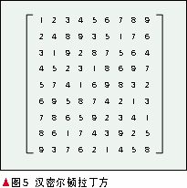 所谓拉丁方是指n×n的方阵中填入n个不同符号,使得每行每列的符号都不重复。显然拉丁方的每两列构成一个n元置换。所谓汉密尔顿拉丁方是指拉丁方的任何两列构成的置换为单环的。图5为一个9阶汉密尔顿拉丁方。