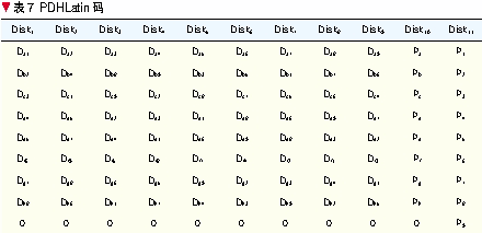 从一个给定的汉密尔顿拉丁方,我们可以用与EVENODD码类似的方法构造编码,只不过各单元对于第二校验盘的校验关系不再依单元所在对角线位置决定,而是根据拉丁方相应位置的符号决定。根据图5,得到表7所示的PDHLatin码。