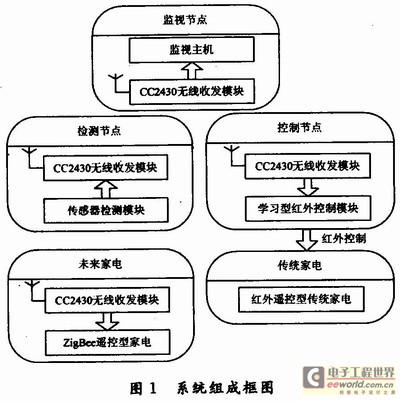 系统组成如图1所示,监控系统主要包括监视节点、传感器检测节点、红外中转控制节点。监视节点能够建立并维护ZigBee网络,同时负责与监控主机的通信。一旦监控主机接入远程网络,该系统即可升级实现远程实时监控。传感器检测节点负责采集家庭光照、温度、空气质量等环境信息。红外中转控制节点可根据采集的信息通过红外线实时控制空调、灯光等传统红外型家电,而对于未来的ZigBee控制型家电,通过CC2430模块便可实现兼容控制。