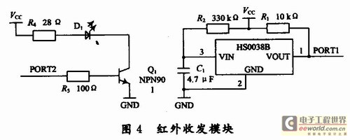红外控制节点以CC2430作为微处理器,采用一体化的红外接收头接收红外信息,以24C64作为存储模块存储学习到得红外编码,考虑到红外发射的距离和有效性,电路红外发射管加入了2个三极管进行两级发大。红外收发部分电路设计如图4所示。