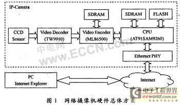 网络摄像机的基本原理为:CCD传感器将光线转变成电荷,并输出CVBS模拟视频信号给视频解码芯片(TW9910);视频解码芯片将CVBS模拟视频信号模数转换(A/D)成YUV 4:2:2格式的数字信号,并输出给视频编码芯片——ML86500;ML86500对视频信息进行编码压缩处理,生成MPEG4数据流;MPEG4数据流经RTP协议封装经过网络发送到远程客户机(PC),远程客户机解码还原视频信息进行播放。