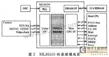 ML86500是OKI公司开发的实时MPEG4图像压缩(编码)处理单芯片产品,该芯片灵活运用了OKI独创算法及专用加速器,低成本实现了高画质,其设计目标就是面向监视摄像机、网络摄像机等图像监控设备。因此本网络摄像机方案中的视频编码芯片选用ML86500。
