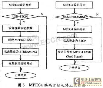 MPEG4编码停止的主要作用是停止视频解码芯片、视频编码芯片工作,停止MPEG4 TASK。MPEG4编码开始及停止流程图如图5所示。