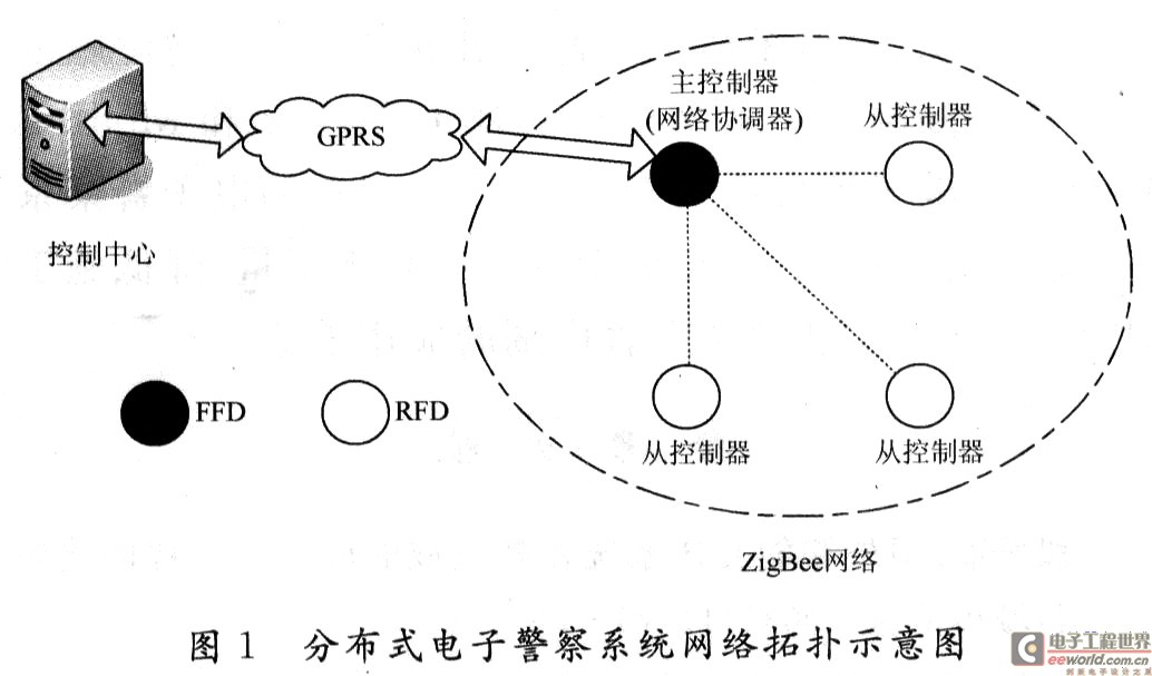 系统的ZigBee网络通信部分由一台主控制器、若干从控制器组成。系统的各个主、从控制器相对独立,各主、从控制器之间通过ZigBee无线网格进行通信,主控制器通过远程无线通信与控制中心通信。网络拓扑示意图如图1所示。