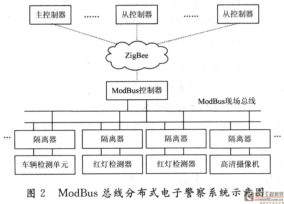 ModBus协议是应用于电子控制器上的一种通用语言。通过此协议,控制器相互之间、控制器经由网络(例如以太网)和其他设备之间可以通信。该协议定义了一个控制器能认识使用的消息结构,描述了一控制器请求访问其他设备的过程,制定了消息域格局和内容的公共格式。ModBus已经成为一通用工业标准,是一种有效支持分布式控制和实时控制的串行通信网络。电子警察系统的车辆检测单元、红灯检测器、高清摄像机、嵌入式工控机等单元占有同一ModBus现场总线。系统示意图如图2所示。