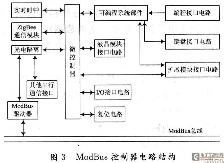 ModBus控制器结构如图3所示。主要由微控制器、可编程系统器件、实时时钟、液晶模块接口、键盘接口、输入/输出接口、光电隔离、ModBus驱动器、其他串行通信模块、复位电路、编程接口、扩展模块接口等电路模块组成。
