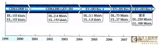 国际标准化组织3GPP2负责CDMA2000标准的制定。2000年10月,3GPP2颁布了1xEV-DORev0标准。CDMA2000 1xEV-DO由CDMA2000 1x演进而来,是第一个可与有线宽带相比拟,提供高速分组数据业务的第三代移动通信标准。与WCDMA不同,CDMA2000有着较为明晰的发展和演进过程。如下图所示:
