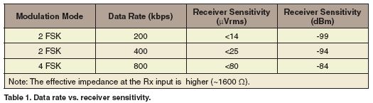 收发器允许用户随接收器灵敏度的不同,从多种数据率(200 kbps, 400 kbps, 800 kbps)中进行选择。为便于实现这一灵活性,系统采用2 FSK或4 FSK调制,每秒200或400千字符,频率偏差可变(见表1)。通过采用片外数字滤波,可以达到更低的数据传输率和相应更高的接收器灵敏度。收发器具有一个MAC旁路工作模式,在该模式下射频完全可用。在这种配置下,用户可以开发定制协议和数据传输率。