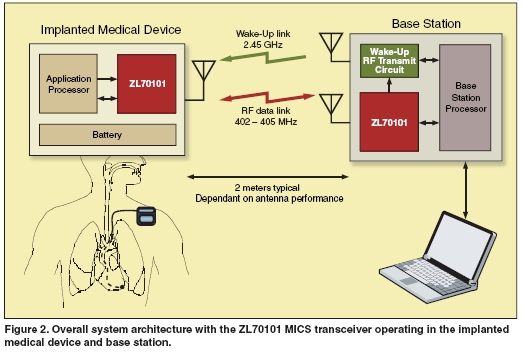 Zarlink Semiconductor公司针对起搏器、神经刺激器、药泵以及其他此类植入式应用医疗设备的一款超低功率RF收发器芯片,其数据传输率高、功耗低,具有独特的唤醒电路。