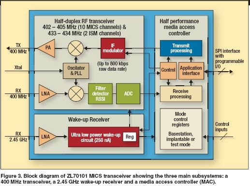 ZL70101 MICS芯片(见图3)包含3个主要的子系统:一个400MHz收发器,一个2.45 GHz唤醒接收器及一个媒体存取控制器(MAC)。根据输入引脚的状态确定芯片用作植入医疗设备,或者基站编程器的收发器。