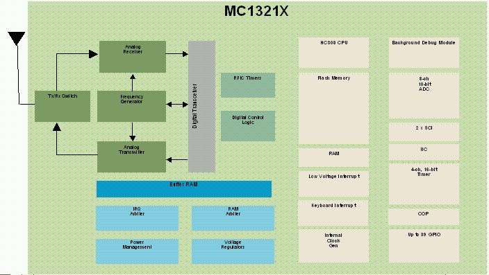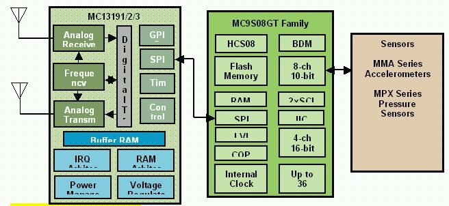 | 图2:飞思卡尔的MC1321xSIP采用兼容MC1319x的收发器和8位HCS08微控制器内核 |
