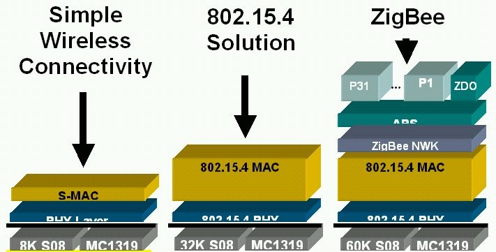 要进行简单的专有无线连接,只需要一个物理层(PHY)以及适用于点对点和STAR网络应用的简单媒体访问控制器软件(SMAC)。简单无线连接的内存要求不足2.5Kb,对于功率要求极低的应用而言,它是非常经济高效的,这些应用包括便携式的一次性医疗监控设备等。