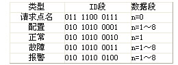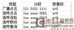 CAN总线上的帧只有至少满足一个接收过滤器的条件才可被接收。为了说明过滤器与屏蔽器的初始化方法,这里首先介绍报文帧。本文系统只使用标准数据帧进行数据传输。标准数据帧的长度为44+8n位,其中11位ID段在本文系统中被分为两部分,高7位用来表示区域机的逻辑地址码,整个系统允许接入的区域机最多为50个,低4位用来表示报文类型码。集中机发送的报文帧如表1所示,区域机发送的报文帧如表2所示。8n位数据段可有可无,在表1中,只有选呼联动报文含有数据段,表示请求联动的设备号,在表2中,只有请求点名报文不含数据段,其余报文必须至少含有1个字节数据,用来表示区域机的逻辑地址码,其余数据用来表示故障、报警的探测器号和设备号,或区域机配置。