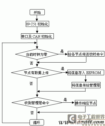 EEPROM24C02存储器数据和时钟芯片DS1302的读写均简单地采用同步串行的方式进行通信。当控制器收到节点的信息后,即将此信息上传给管理层,同时将此信息写入AT24C02存储器,作为历史信息保存,便于管理层的查询。控制器的零点校时功能是通过读取DS1302的时钟,当时钟为零点整时,即统一对各现场CAN节点进行校时,避免了各CAN节点时钟误差的积累。