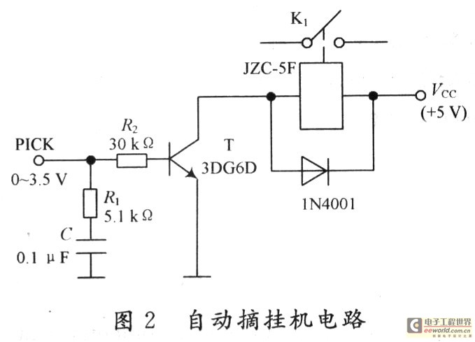 自动摘挂机电路如图2所示。由三极管反相放大电路和继电器组成。系统检测信号电平为0~3.5 V,当系统检测到报警信号时,主控系统使PICK变为高电平,三极管导通,继电器吸合,K1接通,系统自动摘机。当用户执行完命令操作之后(如向外报警过程完成后),主控系统给PICK一个低电平,三极管截止,继电器释放,开关K1断开,自动挂机。