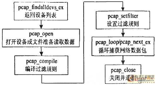 系统采用基于网络嗅探技术的数据采集方法,以WinPcap 4.0.1作为开发工具,Windows平台下使用WinPcap从网络适配器嗅探数据十分方便,图3是使用WinPeap捕获网络数据包的基本流程。
