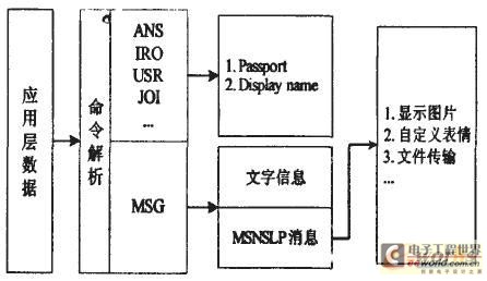 数据分析与处理分为四部分。首先是Ethernet数据帧处理,主要完成链路层数据验证、拆包,并将数据提交给IP层进行处理。IP数据报的处理主要完成IP层数据验证、拆包,并将数据提交给传输层进行处理。TCP分组的处理主要完成TCP层数据的验证、拆分及TCP重复和无序分组的处理,完成TCP会话重建,并将重组后的应用层数据提交至协议分析层处理。协议分析主要完成应用层数据和最终用户数据的处理。对应用层数据主要进行命令解析和协议数据重组,对最终用户数据的处理包括聊天信息的提取、显示图片和自定义表情的提取、文件传输的提取等。MSNP协议分析模型如图4所示。