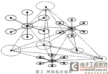 矿井环境监测最基本的要求是及时有效地传递信息,发布预警消息,保证井下安全。为此,无线传感器网络采用网状拓扑结构。完全的网状拓扑控制要消耗传感器节点较多能量,为了在满足网络连通的前提下,尽可能地节约能量,在矿井的每个工作面部署的大量节点中选取少数节点作为骨干网节点,打开其通信模块,关闭非骨干节点的通信模块,由骨干节点建立一个网状全连通网络来负责数据的路由转发。这样既保证了原有覆盖范围内的数据通信,也在很大范围内节约了能量。网络拓扑结构如图2所示。