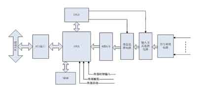 本设计数字控制部分由FPGA和外扩的CPLD共同合作完成。由于设计需要大量的引脚资源,而FPGA的引脚资源有限,所以在FPGA外部通过SPI总线接口外接一片CPLD,从而控制8个通道的输入方式选择和增益选择。FPGA内部嵌入一个NIOSII软核,负责数据采集、数据传输和输入方式以及增益的选择控制。下面详细分析一下这三个数字控制电路的实现方法。
