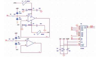 在本设计中,信号调理电路包括输入方式选择电路和增益选择电路。此部分中,高输入阻抗、低输出阻抗的普通运算放大器构成的电压跟随器会对前后电路进行隔离,避免后级多路开关的导通阻抗影响前级电路。输入端加两个二极管,提供±15V的钳位电压,形成过压保护。多路开关选择DG409,它是4通道差分多路开关,具有较低的导通阻抗和低功耗和低泄漏电流。信号的输入方式有四种:0输入、单端正极输入、单端负极输入和差分输入,通过DG409正好可以选择这四种输入方式,电路如图2所示。
