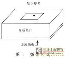 微带贴片天线通常是在一个薄介质基片上,一面附上金属薄层作为接地板,另一面用光刻腐蚀等方法做出一定形状的金属贴片,利用微带线或同轴探针对贴片馈电,如图1所示。因为微带贴片天线自身有一个金属的地板,当其粘附在各种物体上时,天线背面的电磁场不会受到太大影响,故可以在多种环境下正常读取。