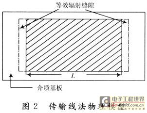 利用传输线模型分析微带天线是较有效的方法。该方法的基本假设如下:微带贴片和接地板构成一段微带传输线,传输准TEM波,场在传输方向是驻波分布。而在其垂直方向是常数;传输线的两个开口端(始端和末端)等效为两个辐射缝口径场,即为传输线开口端场强,如图2所示。