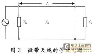 图3是按照传输线法建立的微带天线等效电路。Ys为缝辐射导纳;Y0为微带贴片的特性导纳。