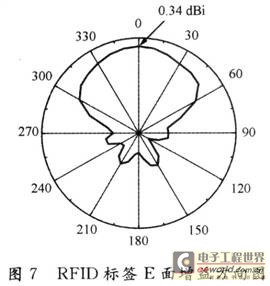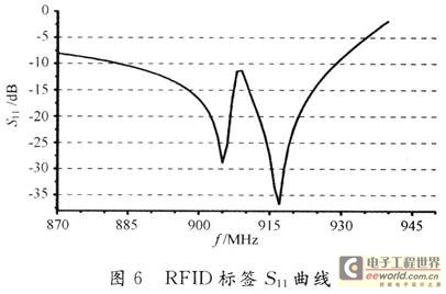 该天线采用的芯片在915 MHz时的阻抗为34.5一j815,呈现明显的容抗。采用Ansoft公司的电磁仿真软件HFSS 10.O对天线进行仿真。经过调试和优化,得到天线的S11曲线,如图6所示。该天线分别在905 MHz和920 MHz有两个谐振频率。在905 MHz时,S11为一28 dB;在920 MHz时,S11为一37 dB,这两个谐振频率都比较窄,通过调整天线,使两个谐振频率靠近915 MHz,以达到增加带宽的目的。该天线增益在915 MHz时仿真结果为0.34 dBi(见图7),满足RFID系统读取的要求。
