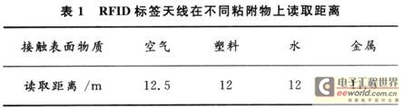 将RFID标签天线分别粘附在装水的塑料盒面(塑料盒很薄)、金属面、塑料制品上或直接放在空气中,读写器在902~928 MHz中设置广谱跳频,RF功率设置为36 dBm,读写器天线增益为12 dBi。测试读取距离如表1所示。该RFID标签的工作性能在不同物质环境中表现出较为满意的一致性。