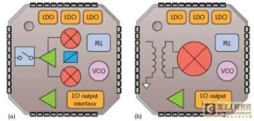图1:ADI的ADRF670x是一个带PLL和VCO的发送调制器(a)。ADRF660x混频下变频器包括一个用于单端50Ω输入的射频输入不平衡变压器和一个带VCO的PLL合成器(b)。这两个器件都适用于LTE和WiMAX基站设计。