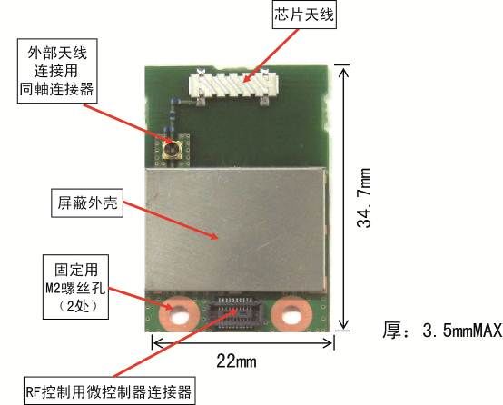 已经获得日本国内电波法认证,因此,无需进行无线通信试验,装到整机中即可立即作为无线设备使用。没有高频电路设计能力和无线特性测量装置的客户也能轻松使用。