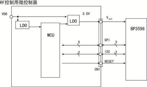 RF控制用微控制器与RFIC连接时,SPI(5pin)、EEPROM通过I2C(2pin)、GPIO连接。与RF控制用微控制器之间的接线图如图3所示。可见,用很少的布线数即可轻松连接。