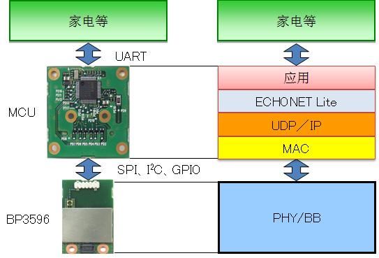 满足ECHONET Lite的协议栈构成例如图4所示,是通过BP3596与微控制器板连接到整机中的。只要具备这样的协议栈,即可将HOST侧本体的变更控制在最小,从而安装920MHz频段特定小功率无线。当然,也可以采用直接存储于HOST的形式。