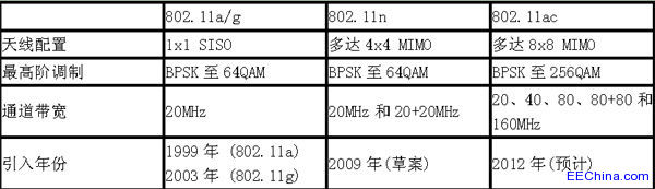IEEE 802.11g是针对单个20-MHz OFDM通道而设计的标准,IEEE 802.11n则支持多达两个20MHz通道的设备实现40MHz的总带宽,从而增加载波聚合技术。相比之下,IEEE 802.11ac支持20、40、80和160MHz通道带宽方案。在40和80MHz模式的IEEE 802.11ac中,通过使用更多的子载波实现了更高的带宽。因此,20MHz模式采用64个子载波,40MHz模式采用128个子载波,80MHz模式采用256个子载波,160MHz模式采用512个子载波。相比之下,80+80 MHz模式的IEEE 802.11ac将采用略有不同的方案。在这种模式下,载波聚合方案将通过接入点同时采用两个唯一的80MHz OFDM通道(每个通道256个子载波)。在下表中,我们对各种常见IEEE 802.11标准的不同调制类型、MIMO方案和通道带宽进行了比较和对比。