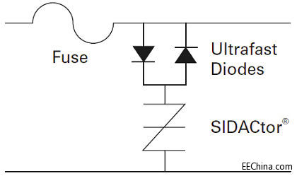 如果使用ADSL线路,可采用单个GDT或SIDACtor提供保护,在需要电源故障保护的情况下,还应配备一个熔断器。在此类应用中,最好采用微电容SIDACtor以减少信号失真。如果电容值太高,可安装反并联连接的一对离散超快开关二极管(图1),将总电容降低至15pF,也可以采用内置上述二极管的SDP或SEP SIDACTOR系列。