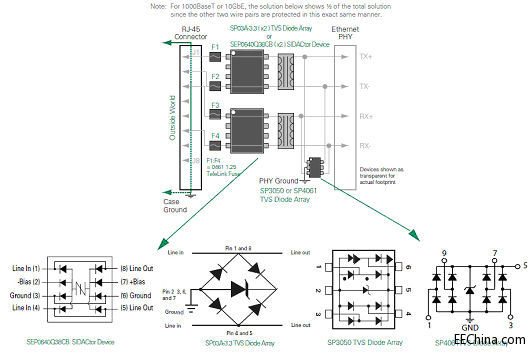 图2:用于建筑物之间的以太网线路可采用超快TVS二极管、熔断器,以及超低电容二极管阵列实现保护