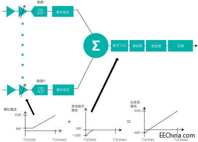 所以,使用高SNR接收器的系统必须采用数字增益调节技术,以提供附加的TGC增益调节范围。通常在波束成形器之后安装由软件控制的数字衰减器,以提供必要的附加调节范围。下图9所示为带有数字和模拟增益电路的系统方框图。从图中可看出如何组合使用模拟接收器VGA和数字增益调节,以提供足够的调节范围。对于较低的TGC增益,使用数字衰减器通过数字方法调节。本例中,较低的12dB调节范围是利用该技术实现的;对于超过TGC范围较低12dB的TGC增益,利用接收器中的模拟VGA实现增益调节。